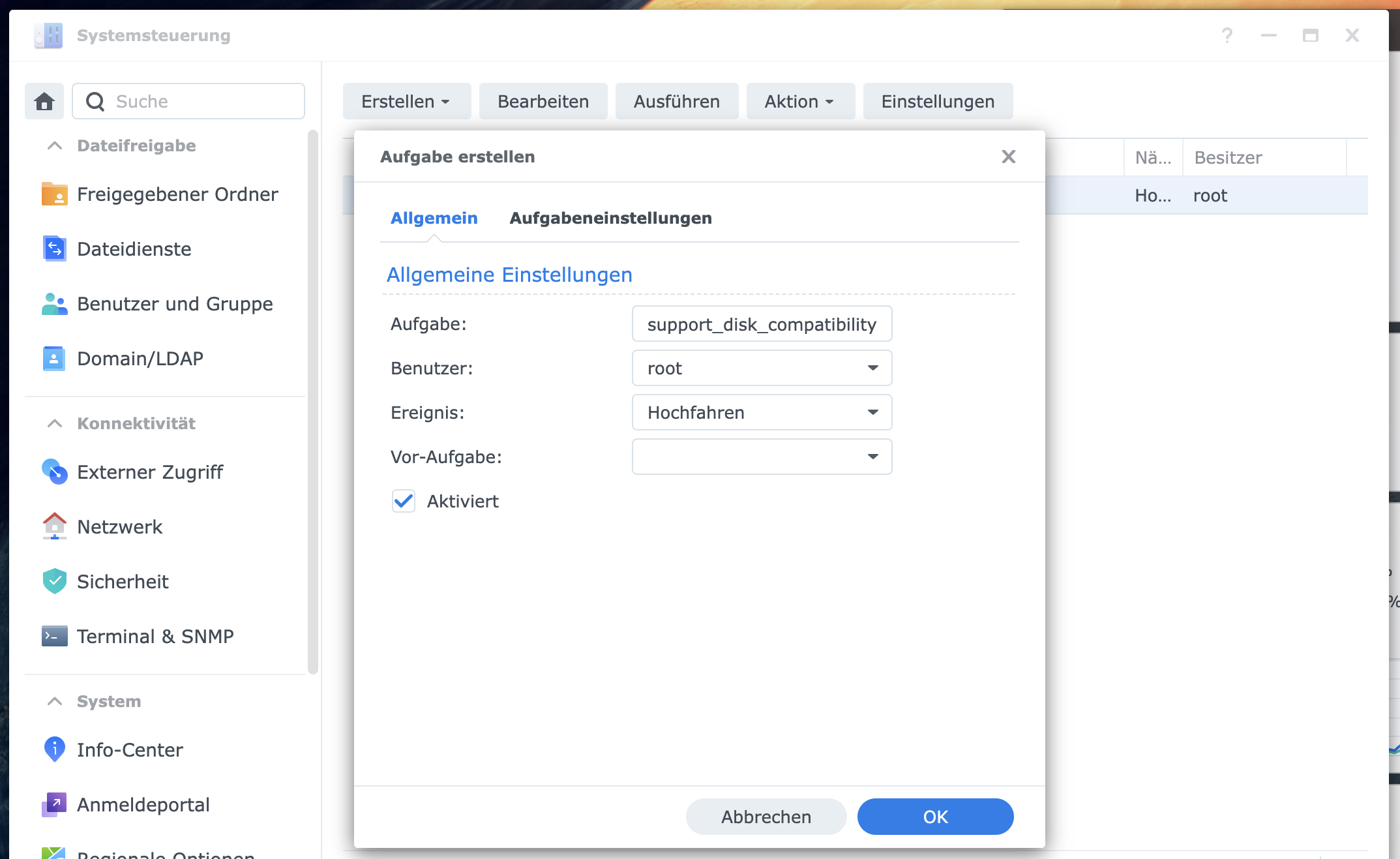 Synology setzt von Zeit zu Zeit, nachdem neue Updates eingespielt wurden, die oben genannten Parameter auf «default» zurück. Um dem automatisiert entgegenzuwirken, kann im Aufgabenplaner unter «Erstellen» dann «Ausgelöste Aufgabe» -> «Benutzerdefiniertes Script» wie folg ein neue Aufgabe erstellt werden: