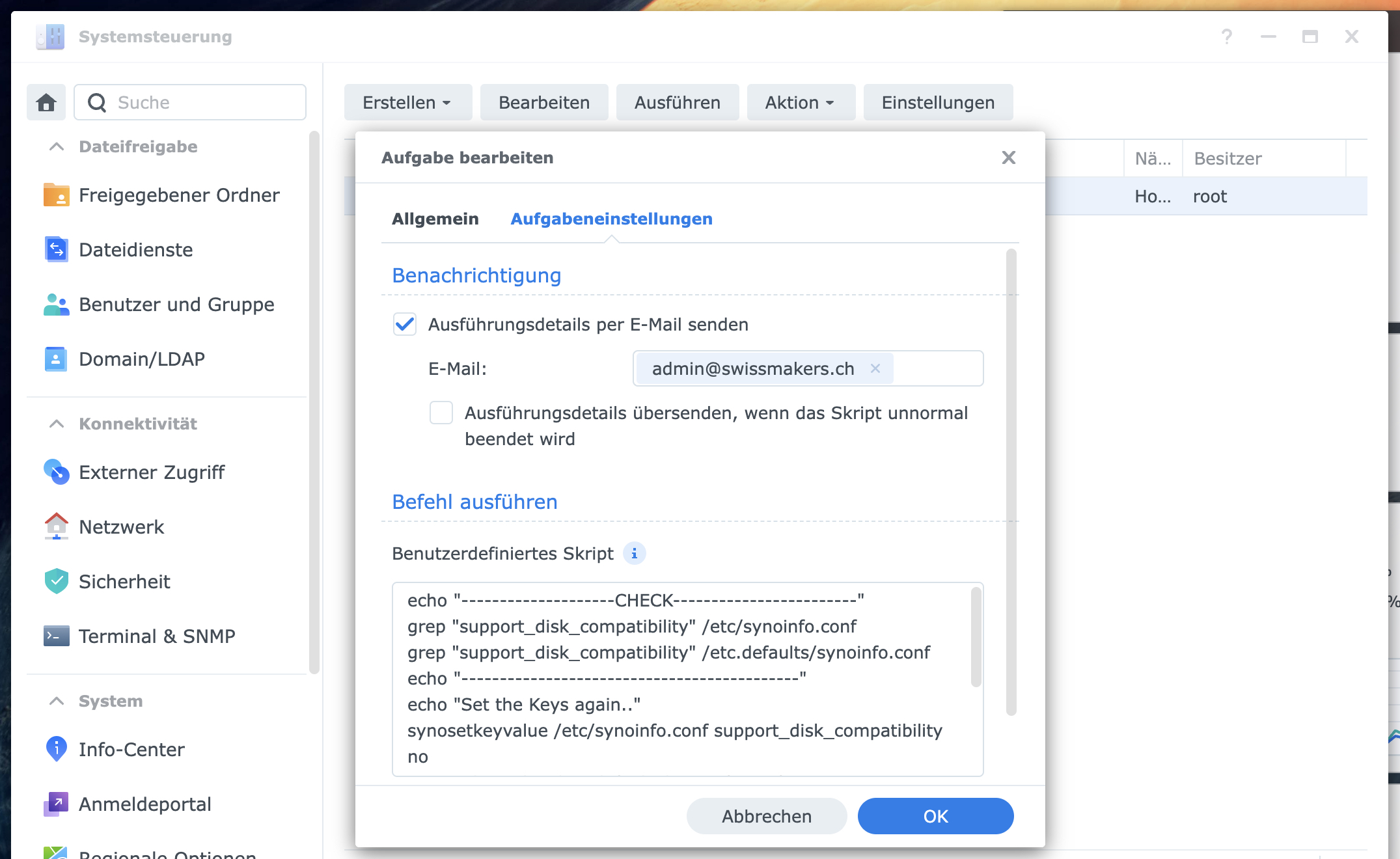 Tipp: Sobald die Aufgabe erstellt und gespeichert wurde, kann diese über den Knopf «Ausführen» das erste Mal manuell ausgeführt werden. Um die Darstellung im UI nachzutragen, sollte das Synology anschliessend neu gestartet werden.