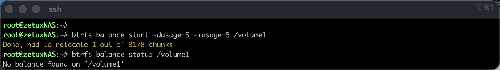 btrfs balance start -dusage=5 -musage=5 /volume1