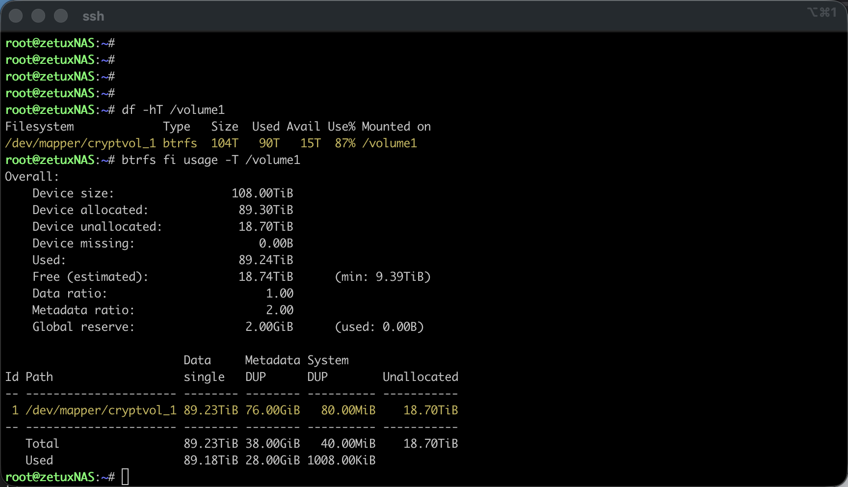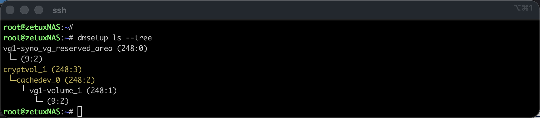 Ein Reboot ist nicht in allen Fällen nötig, jedoch falls das Volume1 zusätzlich verschlüsselt wurde, oder das Synology den Einbau eines Caches unterstützt, so muss noch vor dem btrfs resize das dm-crypt/LUKS-Device (cryptvol_1) als sowohl das darunter liegende cachedev_0 auf die neue LV-Grösse vergrössert werden. Eine kurze Kontrolle erfolgt anhand: # dmsetup ls --tree