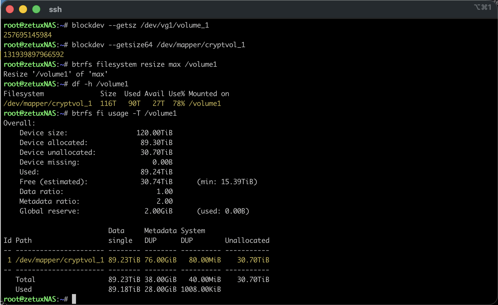 btrfs filesystem resize max /volume1