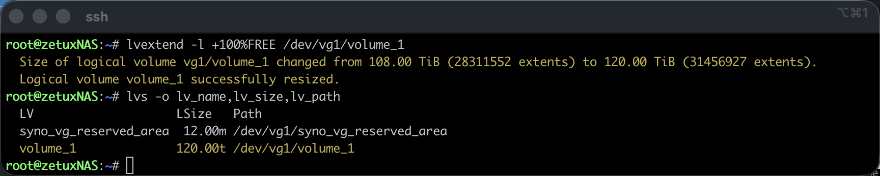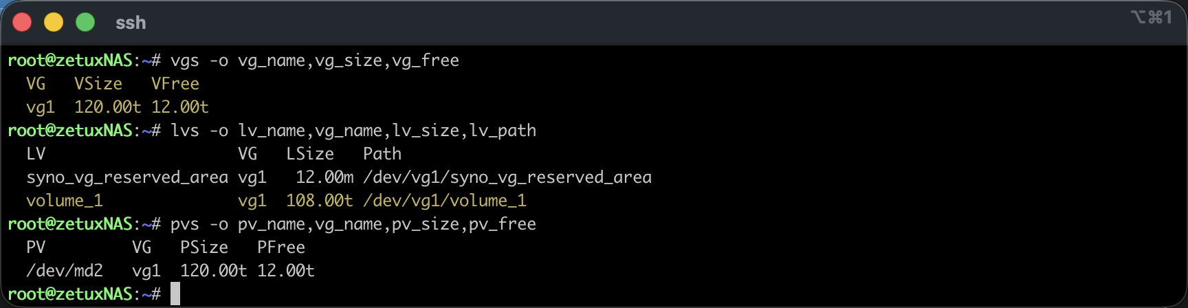 Zuerst wähle ich den sicheren Einstieg per SSH und eskaliere auf root (Wie das genau gemacht werden kann, wurde bereits hier beschrieben: Link). Danach prüfe ich die beteiligten Storage-Schichten.# df -hT /volume1 bestätigt das Dateisystem und den Mountpunkt, # mount | grep volume1 zeigt die tatsächliche Gerätedatei, die bei Synology in der Regel bei verschlüsselten Volumen über den Mapper als /dev/mapper/cryptvol_1 eingebunden ist. Mit # vgs -o vg_name,vg_size,vg_free,# lvs -o lv_name,vg_name,lv_size,lv_path und # pvs -o pv_name,vg_name,pv_size,pv_free verschaffe ich mir Klarheit, wie die Volume Group heisst, welche Logical Volumes existieren und wie viele freie Extents im Pool tatsächlich anliegen. An dieser Stelle sollte «VFree» eine Grössenordnung um die in der GUI angezeigten 12 TB, «12.00t» frei zeigen; entscheidend ist ausserdem der exakte lv_path, meist /dev/vg1/volume_1.
