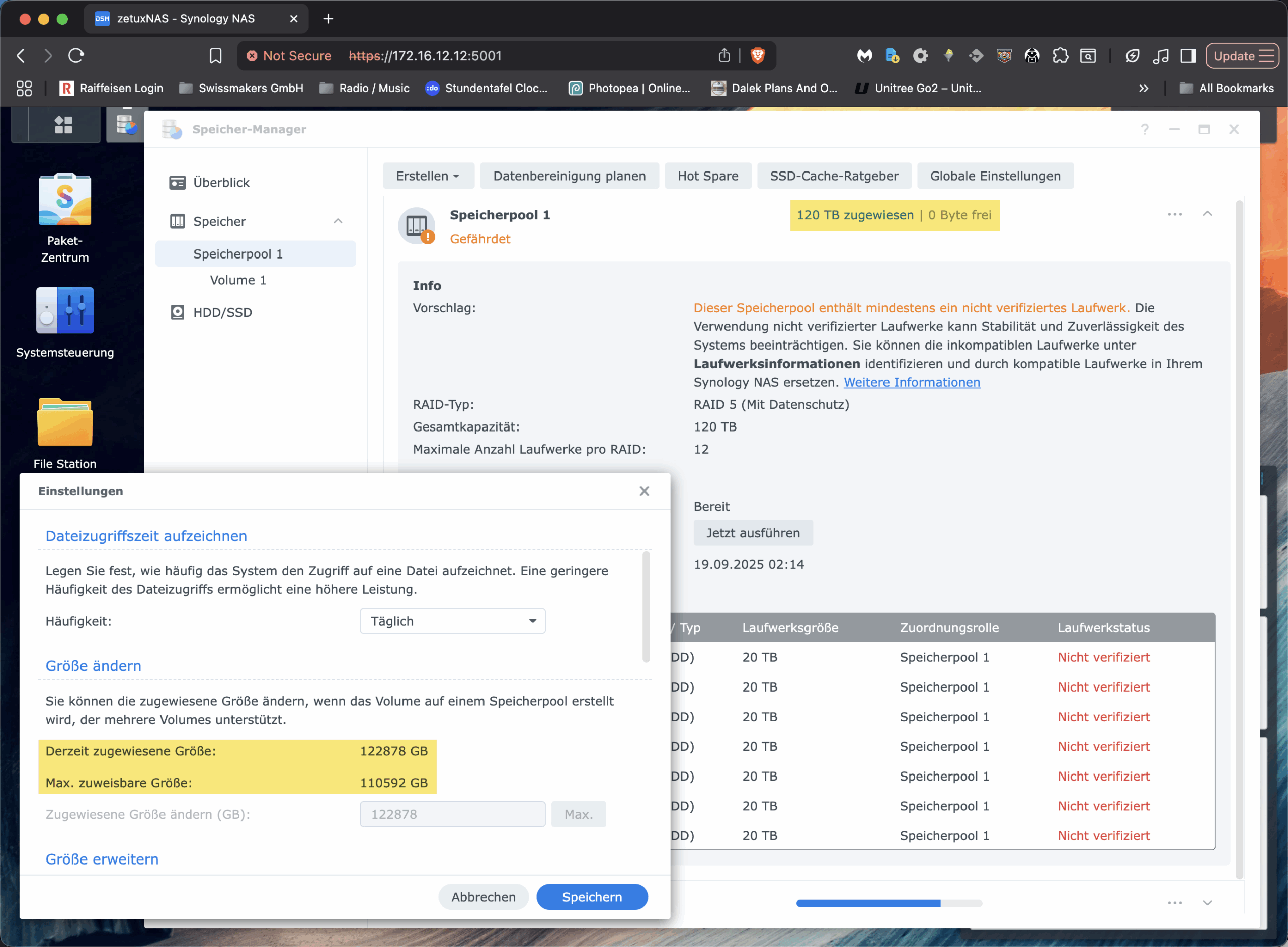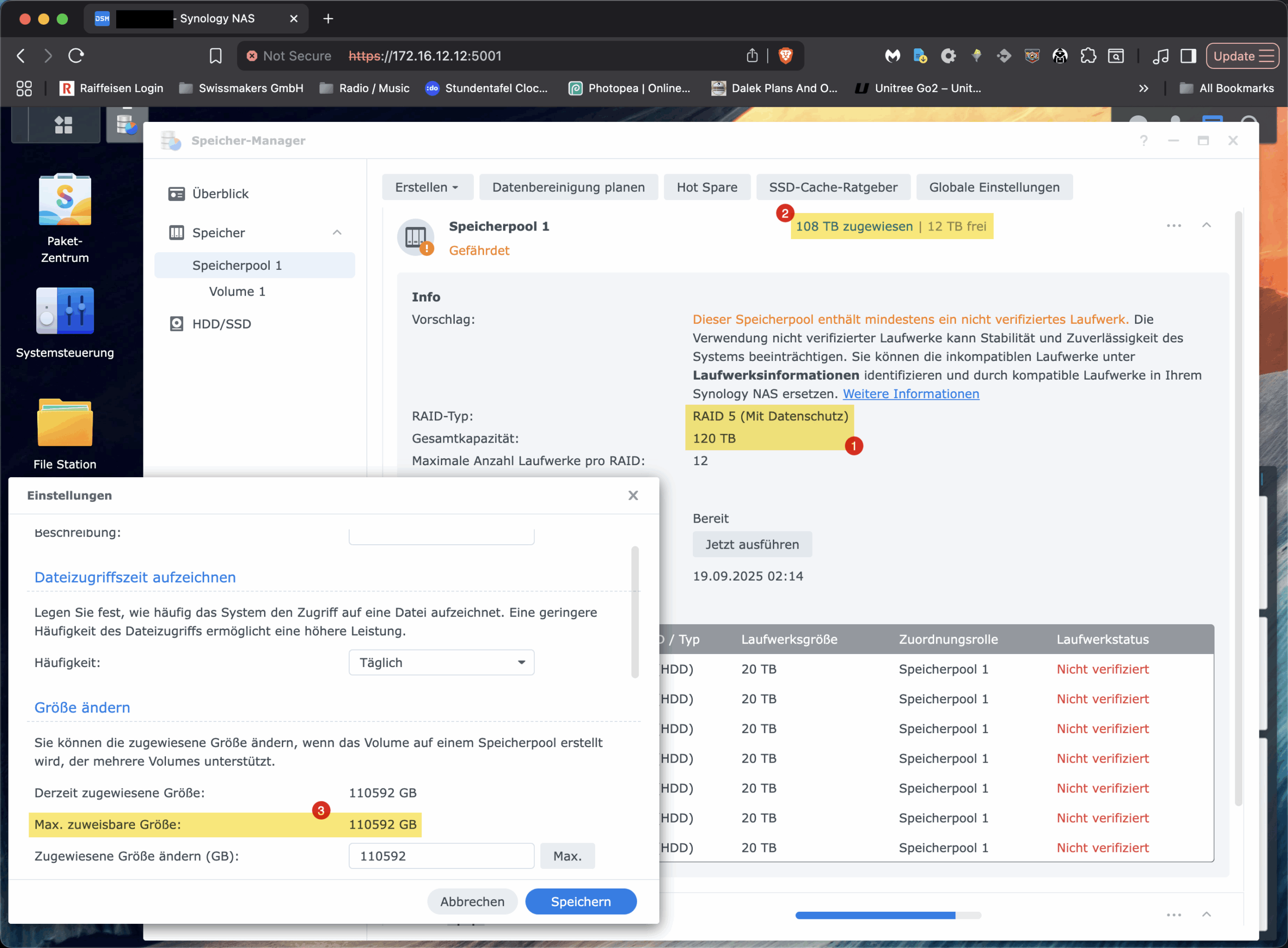 Vor dieser Frage stand ich kürzlich, als wir bei einer unserer Installationen von Swissmakers vor einem vertrauten, aber irritierenden Phänomen standen: Ein Synology-NAS mit sieben 22-TB-HDDs im RAID-5 zeigte im Speicherpool korrekt rund «120 TB» an (1), liess aber das vorhandene Volume partout nicht über ca. 108 TB vergrössern (2/3). Die Oberfläche bot keine Option, obwohl der Pool noch freie Kapazität hatte. Für alle, die ähnliches beobachten und in dem GUI gegen eine unsichtbare Decke laufen: Das ist kein technologisches Limit von Btrfs oder LVM und hat auch nichts mit der RAM-Bestückung zu tun. Es ist eine modellabhängige Software-Schranke in der DSM-Oberfläche. In diesem Beitrag zeige ich, warum das so ist und wie man das Synology Volume trotzdem sauber und online per CLI über diese Grenze hinaus erweitert.